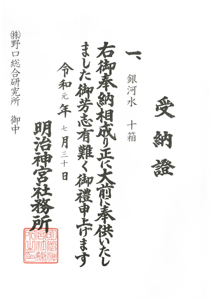 銀河水ご奉納 2019/08/21 毎年7月30日の明治神宮祭斎行に際して、ご神前に「銀河水」をご奉納させていただいています。かれこれ十数年以上前に明治神宮社務所よりご奉納をお願いされましたのをきっかけに毎年継続しており、今年は写真のように盛大に献上していただきました。 歴史と由緒ある明治神宮の祭典に自社製品をご奉納させていただくことは、とても意義あることと考えています。日本の伝統や自然を大切にする心をいつも忘れずに、今後も真摯に「銀河水」を作り続けていきたいと思います。 明治天皇祭 奉献記念品の扇子