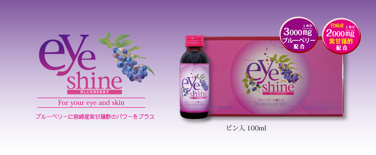 青紫色の果実であるブルーベリーには、抗酸化物質ポリフェノールのアントシアニンが含まれています。また、宮崎産紫さつまいもを醸造させた紫甘藷酢には、アントシアニンやクロロゲン酸などのポリフェノールが豊富に含まれています。紫甘藷酢にブルーベリーやカシスエキス、ハチミツなどを配合した赤ワイン色の健康ドリンク「アイシャイン」。ポリフェノールたっぷりで1本あたり36kcalと低カロリーなヘルシーで美味しいドリンクです。